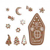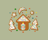 Boże Narodzenie wektor pierniki litery HO HO i gwiazdki płatki śniegu na białym tle Ręcznie rysowane w stylu kreskówki. Tradycyjne kolory na wakacje są czerwone, zielone i żółte. Pyszne ciasteczka