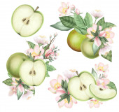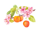 Akwarela gałązki jabłka, liście i kwiaty na plakaty, kartki ślubne, banery letnie