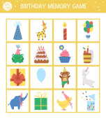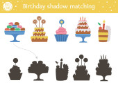 Urodzinowe cienie pasujące do aktywności dzieci. Zabawa puzzle z cute obiektów strony. Świętowanie gry edukacyjnej dla dzieci z symbolami wakacji. Znajdź właściwą sylwetkę arkusza roboczego do wydruku.