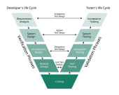 V Schemat metodyki opracowywania oprogramowania modelowego. Infografika cyklu życia. Faza weryfikacji, walidacji. Zbieranie wymagań, analiza systemu, projektowanie, kodowanie, testowanie systemów jednostkowych.
