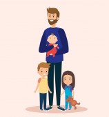 Młody portret 5 członków rodziny rodziców z trójką dzieci stojących prosto. Ojciec z synem na rękach, Mather z córką na rękach.
