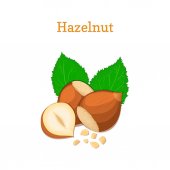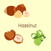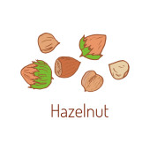 To odizolowana od wektora kolekcja narysowanych orzechów laskowych, ziaren, orzechów i liści pod różnymi kątami. Brązowe orzechy laskowe na białym tle..