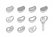 Zestaw ikon sylwetki steka. Zarys wołowiny z kością, tłuszczem, paskami do grilla, widelcem. Różne poglądy na surowe mięso do projektowania opakowań. Czarna ilustracja. Płaski izolowany piktogram wektorowy, białe tło