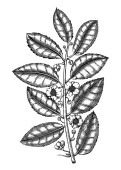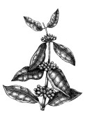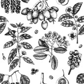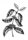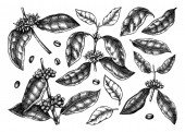 Hand sketched Coffee plants with beans, leaves and flowers. Botanical drawing of flowering plant on white background. Hand drawn coffee tree branches and engraved style.