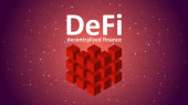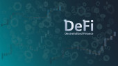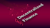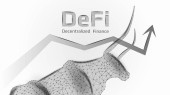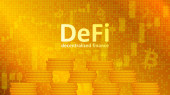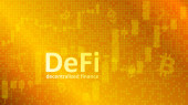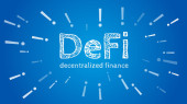 Zdecentralizowany decentralizowany trend finansowy z wielokątnym bykiem i strzałką w górę na ciemnoniebieskim tle. Nowoczesny neon wektor ilustracji.