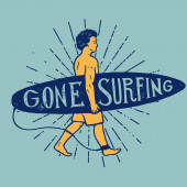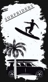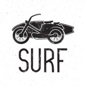 Vintage ręcznie rysowany letni T-Shirt. Poszedł surfować ze starym samochodem, vanem i znakiem shaka. Idealny do podkładki, kubka lub innych odcisków. Ilustracja wektora.