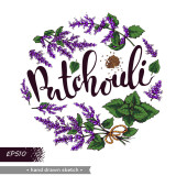 Kwiatostany paczuli, kwiaty i gałąź z liśćmi. Szczegółowe ręcznie rysowane szkice, ilustracja wektorowa botaniczna