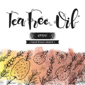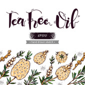 Tło z gałęzi z liści i kwiatów drzewa herbacianego i liternictwa. Szczegółowe ręcznie rysowane szkice, ilustracja wektorowa botaniczna.