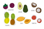 Zdjęcie "Zestaw tropikalnych owoców. Jasna i kolorowa gruszka, jabłko, cytryna, limonka, arbuz, pomarańcza, durian, pithaya, ananas, mango, mango, rambutan, banany, persymony, awokado, papaja, guawa." może być wykorzystywane do celów osobistych i komercyjnych zgodnie z warunkami zakupionej licencji Royalty-free. Obraz jest dostępny do pobrania w jakości wysokiej rozdzielczości do 5760x3840.