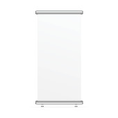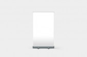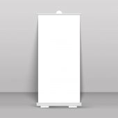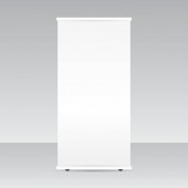 Web3d realistyczny wektor pusty roll-up banner z cieniem izolowanym na szarym tle.