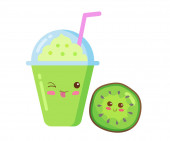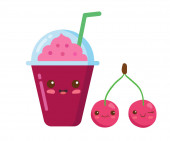 Mrożone owoce Smoothie w plastikowym kubku z bogatą pianką. Wektor kawaii pić ilustrację w uroczym stylu kreskówki izolowane na białym tle. Truskawkowy koktajl owocowy. Koncepcja menu dla dzieci.