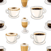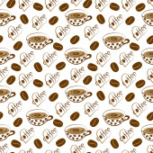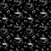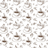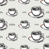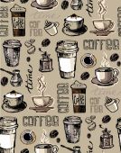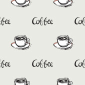 Kawa bez szwu, wzór herbaty wyizolowany na białym. Ręcznie rysowane kubki kawy niekończące się tło z literami. szkic doodle stylu wektor ilustracji. grawerowane vintage tło szablon z gorącymi napojami