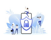 Koncepcja wektora bezpieczeństwa telefonu komórkowego. Młody mężczyzna próbuje odblokować telefon komórkowy kluczem. Ochrona danych. Silne hasło i logowanie.