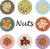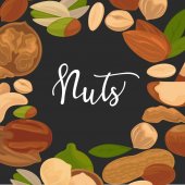 Orzechy w zestawie z różnymi rodzajami orzechów - orzechy brazylijskie, kokosowe, nerkowca, orzechy laskowe, pistacje, orzechy ziemne, makadamia, orzechy ziemne, cedrowe, migdałowe i kasztanowe. Ilustracja sztandar wektorowy izolowane