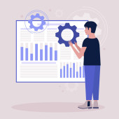 Młoda kobieta trzyma sprzęt i generuje pomysły na wykresy raportów, statystyki przedsiębiorstw, analizy