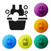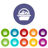 Biały plastikowy basen z ikoną mydła suds izolowane na białym tle. Miska z wodą. Ubrania do prania, środki czystości. Zestaw ikon w kolorach kwadratowych przycisków. Wektor.