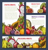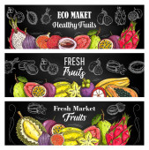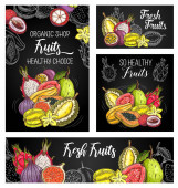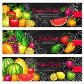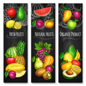 Plakaty ze szkicami wektorowymi świeżych owoców, naturalnym ananasem, arbuzem, morelą lub winogronami ze śliwką. Organiczna gruszka, mango, pomarańcza i melon z kiwi, awokado. Ręcznie rysowane ekologiczne produkty rolne naturalny asortyment