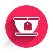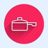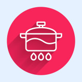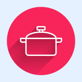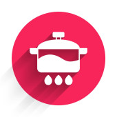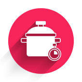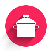 Biała ikona gotowania garnka izolowane z długim cieniem. Gotować lub dusić symbol żywności. Czerwony przycisk. Wektor.