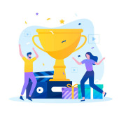 Zwycięstwo w konkursie. Sukces pracy zespołowej. Koncepcja partnerstwa biznesowego na płaskiej ilustracji wektora.
