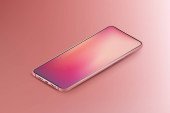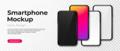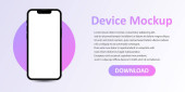 Realistyczna makieta smartfona. Telefon komórkowy 3d z czystym ekranem na kolorowym tle. Nowoczesna makieta szablonu telefonu komórkowego w abstrakcyjnej scenie z różowymi i niebieskimi sferami