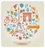 Paryż tło w stylu retro vintage. Plakat lub sztandar Francji, wieża Eiffla i budynki. Retro elementy doodle. Ręcznie rysowany szkic retro. Zabytkowy styl monochromatyczny.