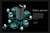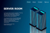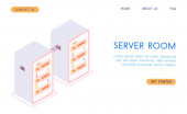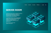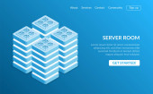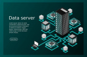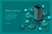 Izometryczna serwerownia. Futurystyczna technologia ochrony i przetwarzania danych. Główny komputer, zasilany serwer, zaawansowana technologia, centrum danych. Ilustracja wektora