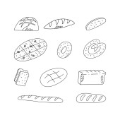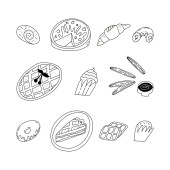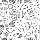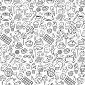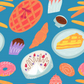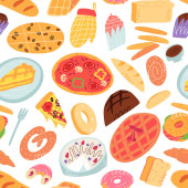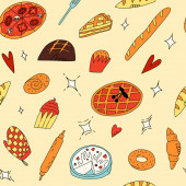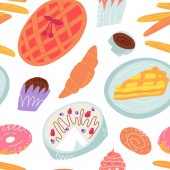 Cute doodle seamless pattern with various traditional American, Spanish, German, Italian and other bakery and pastry.