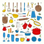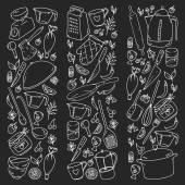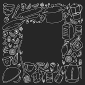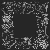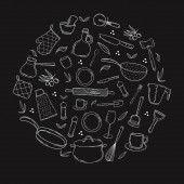 Ręcznie rysowana kolekcja naczyń kuchennych i naczyń stołowych. Sztuka linii na tle tablicy. Doodle Sprzęt do gotowania ramki, okrągły kształt wewnątrz.