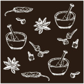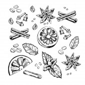 Zdjęcie " Ręcznie narysowany szkic zestawu napojów: kubek z grzanym winem, cytrusami, cynamonem, anyżem gwiazdkowym, ziarnem kawy, miętą, cukrem, goździkami. Ilustracja wektora. " może być wykorzystywane do celów osobistych i komercyjnych zgodnie z warunkami zakupionej licencji Royalty-free. Obraz jest dostępny do pobrania w jakości wysokiej rozdzielczości do 5760x3840.