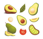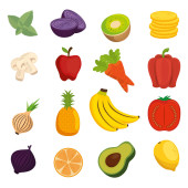 Wegetariańskie ikony żywności w stylu kreskówki. Kolor świeże tropikalne owoce organiczne. Ilustracja zbiorów owoców zdrowotnych.