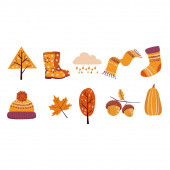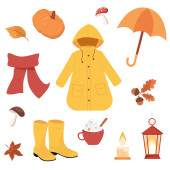Wektorowy zestaw elementów jesiennych. Naklejki w stylu jesiennej kreskówki. Kolekcja sztuki klip izolowane na białym tle