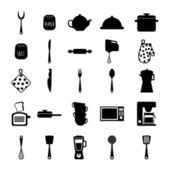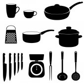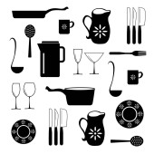 Czarne monochromatyczne sylwetki akcesoriów kuchennych na białym tle.