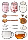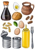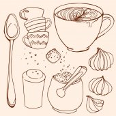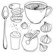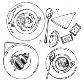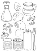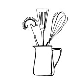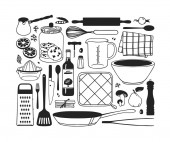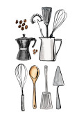 Narzędzia kuchenne. Whisk, łyżka, łopatka. Wektorowy szkic jedzenia w atramencie na białym tle. Ilustracja