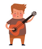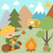 Wektor uroczy chłopiec gra na gitarze i śpiewa siedząc na pniu. Scena ogniska z uroczym dzieciakiem i żabą. Podróżnik odizolowany na białym tle. Obóz plenerowy lub letni ikona turystyczna.
