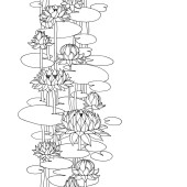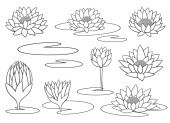 zestaw kwiatów i liści lilii wodnych, na ozdoby, dekoracyjne ramy i granice, ilustracja wektor z czarnym konturem linie izolowane na białym tle w stylu doodle & ręcznie rysowane