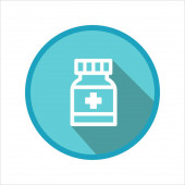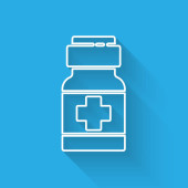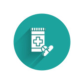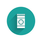 Zdjęcie "Biała linia Lekarska butelka i ikona pigułki izolowane z długim cieniem. Opakowanie leku medycznego na tabletki, witaminy, antybiotyki, aspirynę. Zielony przycisk koła. Wektor." może być wykorzystywane do celów osobistych i komercyjnych zgodnie z warunkami zakupionej licencji Royalty-free. Obraz jest dostępny do pobrania w jakości wysokiej rozdzielczości do 5760x3840.