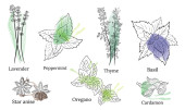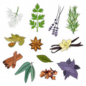 Rysunek ziół i przypraw zestaw. Szkic naturalnych przypraw i kocich ziół. Botaniczne ilustracje roślin aromatycznych.