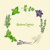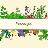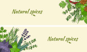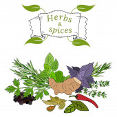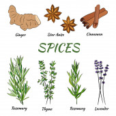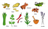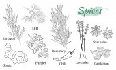 Rysunek ziół i przypraw zestaw. Szkic naturalnych przypraw i kocich ziół. Botaniczne ilustracje roślin aromatycznych.