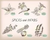 Rysunek ziół i przypraw zestaw. Szkic naturalnych przypraw i kocich ziół. Botaniczne ilustracje roślin aromatycznych.