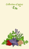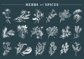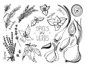 Rysunek ziół i przypraw zestaw. Szkic naturalnych przypraw i kocich ziół. Botaniczne ilustracje roślin aromatycznych.