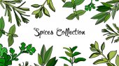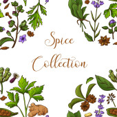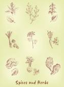 Rysunek ziół i przypraw zestaw. Szkic naturalnych przypraw i kocich ziół. Botaniczne ilustracje roślin aromatycznych.