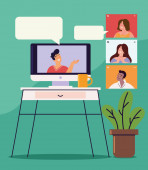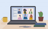 Stay and work from home. Video conference illustration. Workplace, laptop screen, group of people talking by internet. Hand drawn style vector design illustrations.