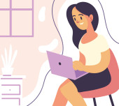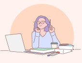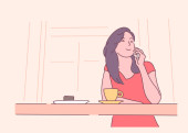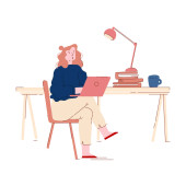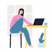 Business, woman manager in office concept. Young happy smiling businesswoman clerk cartoon character sitting at work table with coffee and laptop.