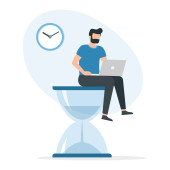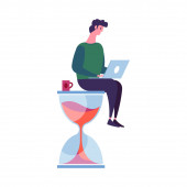 Zarządzanie czasem, koncepcja biznesu. młody szczęśliwy człowiek menedżer, chłopiec freelancer postać pracuje na laptopie.