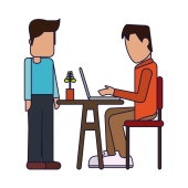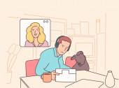 Stay and work from home. Video conference illustration. Workplace, laptop screen, group of people talking by internet. Hand drawn style vector design illustrations.