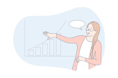 Koncepcja diagramów analizy danych wizualnych. Młoda, inteligentna kobieta analizująca dane na ekranie projekcyjnym. Ilustracja wektora płaskiego