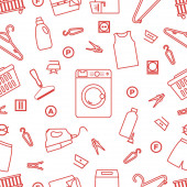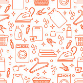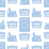 Wektor Płynny wzór Ilustracja Pralnia Pralka, kosz na pranie, detergenty, żelazko, szpilki do ubrań, wieszak, pościel. Zadania pralni dla gospodarstw domowych Projektowanie druku