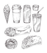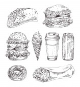 Bagel chleb i kanapki zestaw, izolowane na białym tle. Fast food snacks wektor szkic ilustracji. Bułka z łososiem, serem, szynką i pomidorem. Cafe lunch menu ręcznie rysowane vintage elementy projektu