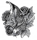 Japan koi fish tattoo, water animal design concept. Koi fish black line art, hipster boho style. For tattoo, coloring book, poster, t-shirt print. Tribal engraved vector isolated white background