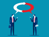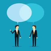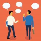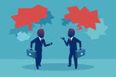 Dwóch biznesmenów wskazujących w przeciwnym kierunku. Kreatywna koncepcja komunikacji zespołowej lub dyskusji. Proste modny ładny wektor ilustracji. Nowoczesny abstrakcyjny płaski styl projektowania graficznego.
